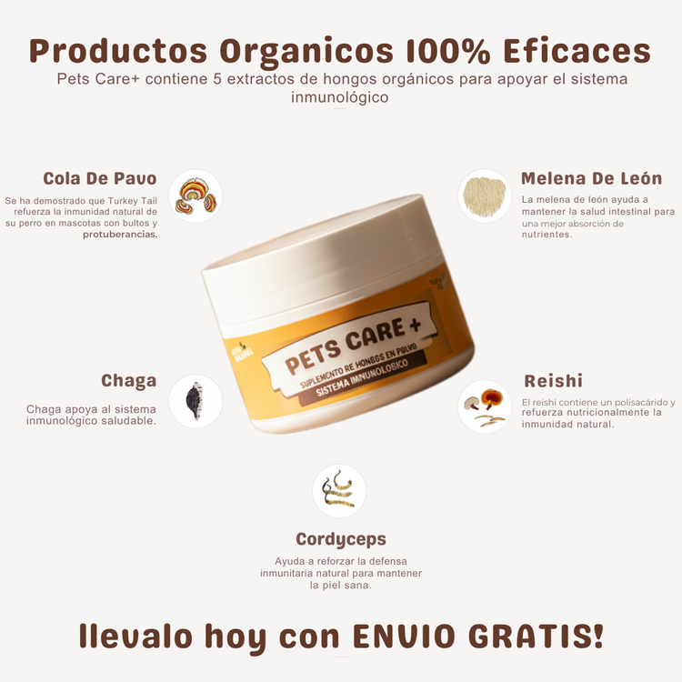 🐾 ¿Cómo podrías ayudarlo? Nuestra fórmula natural a base de hongos medicinales y nutrientes refuerza el sistema inmunológico y mejora el equilibrio interno de tu mascota. 🌱 Devolviéndole bienestar, energía y vitalidad, mientras ayuda a minimizar alergias, problemas de piel, bultos e inflamaciones, y malestar digestivo.