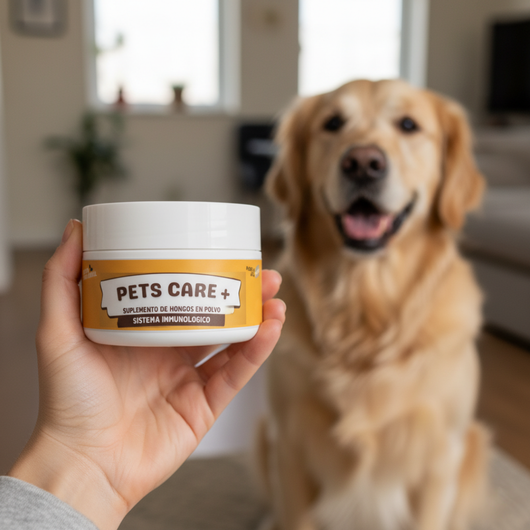 PETS CARE+ combina hongos funcionales y nutrientes naturales, seleccionados por su eficacia y seguridad en perros, especialmente en etapas adultas y senior.