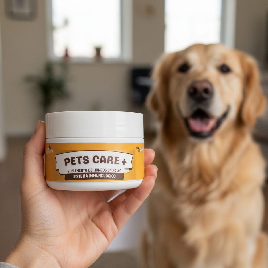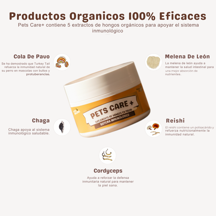 Pets Care+ combina extractos puros de hongos medicinales de origen orgánico, seleccionados por su alta concentración de compuestos bioactivos. Su fórmula está diseñada para fortalecer el sistema inmune, mejorar la energía diaria y apoyar la salud integral de tu perro sin químicos, saborizantes artificiales ni conservantes.